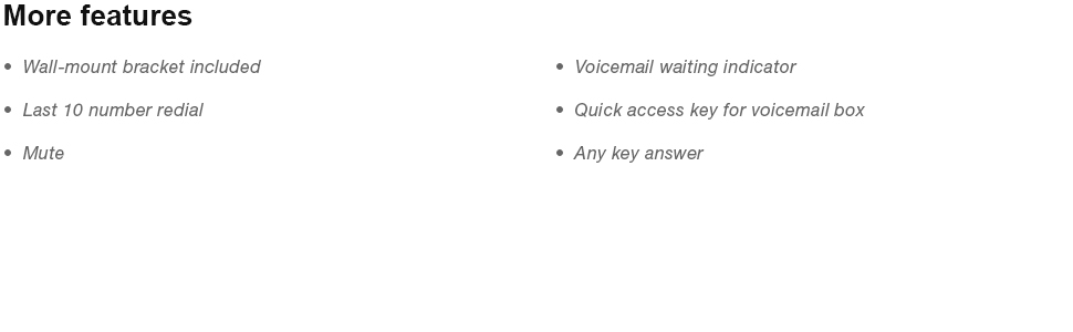 [More Features] – Intercom between Handsets, Quiet mode, Last 10 number redial, Mute Function, Any Key Answer, Voicemail Waiting indication (Network dependent), Voicemail box Quick Access Key, Volume Control, Trilingual prompts (English / Spanish / French), Table & Wall Mountable.