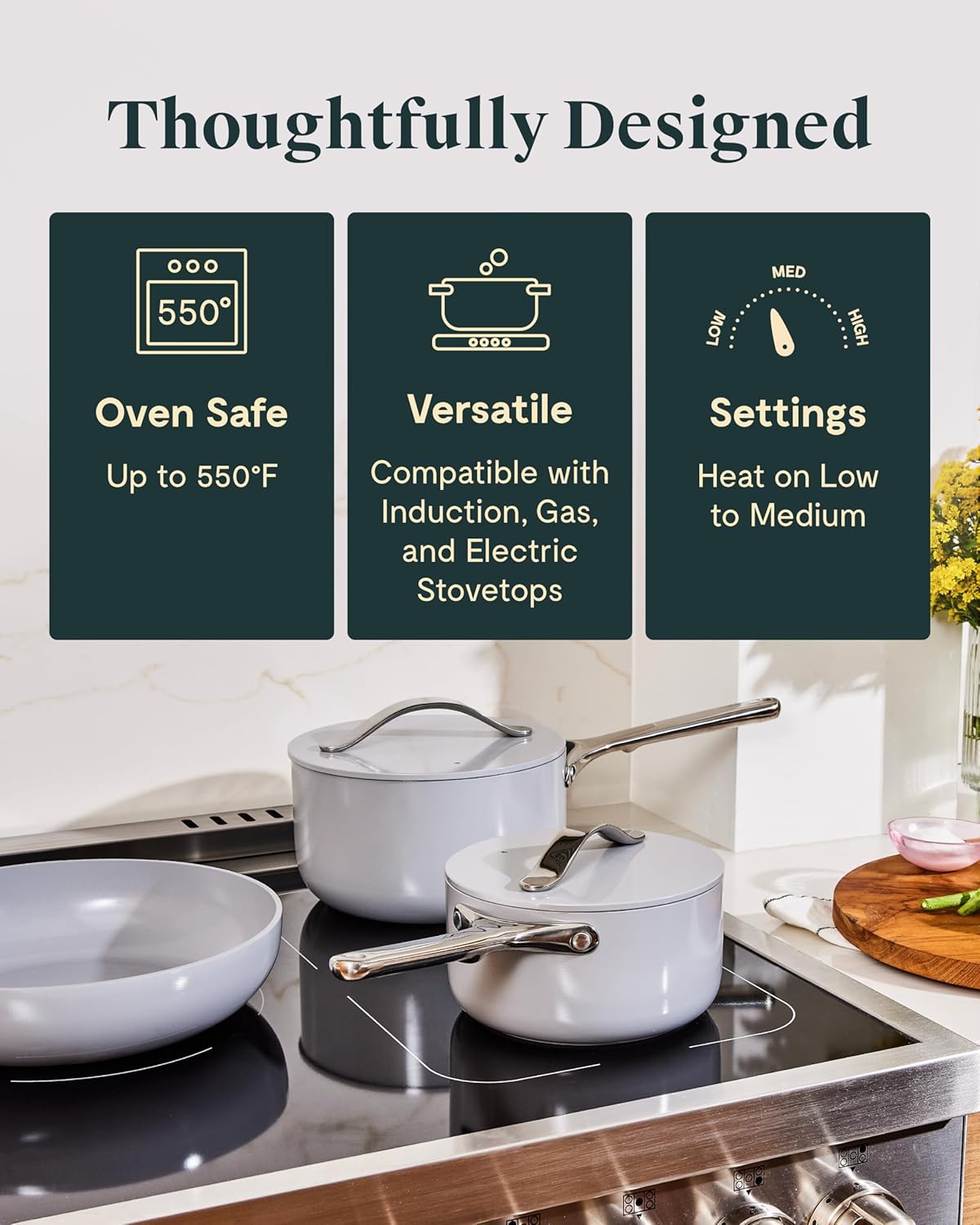SIMPLE CARE: Our cookware ais made for any kitchen and cooktop. Use them on low to medium heat and add a dash of oil or butter for an effortless glide. Our cookware is also oven-safe up to 550ºF.