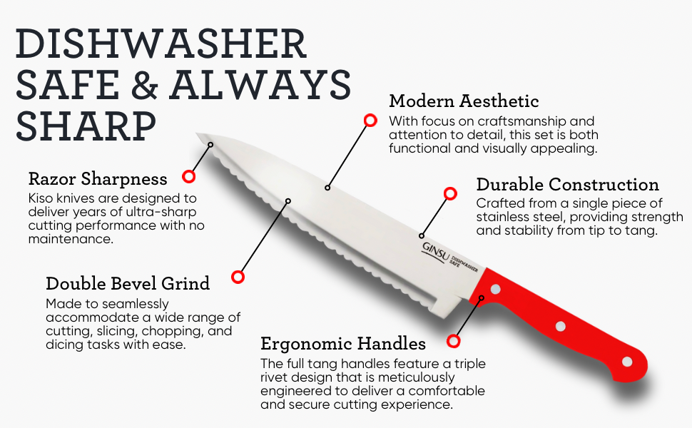 Easy To Maintain: Backed by our exclusive scalloped serration, Ginsu??s forever sharp knives make chopping, slicing, and dicing effortless. No maintenance is needed. And with a mirror polished finish, these knives are easier than ever to clean– just place them in the dishwasher