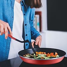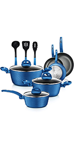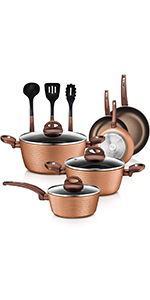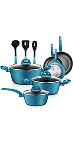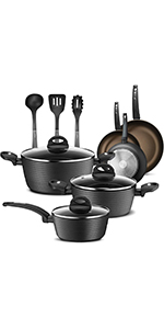 SEE-THROUGH LIDS: The non stick cookware pots and pan set are equipped w/ see-through multi-sized tempered glass lids w/ vent holes that allow steam to escape and includes heat-resistant kitchen tool utensils for hassle-free cooking