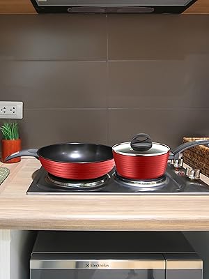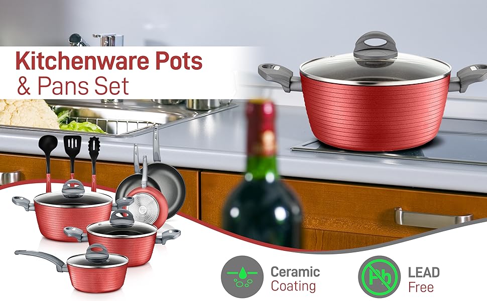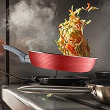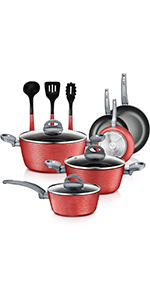 NON-STICK COATING: The PTFE/PFOA/PFOS-free non stick pots and pans sets cooking ware features a long-lasting dark gray nonstick coating inside for easy food release or tossing, cleaning & healthy cooking w/ red heat resistant lacquer exterior