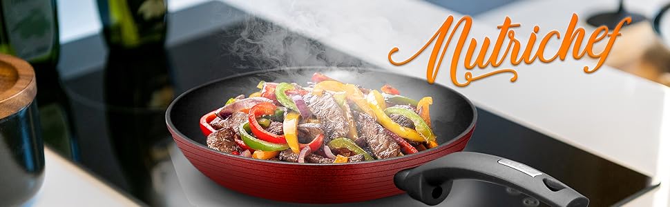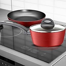 INDUCTION READY: The pots & skillet fry pans are safe for gas, electric, ceramic & induction counter cooktops. Made of reinforced forged aluminum metal w/ 18-25 um coating thickness that effectively distributes & retains heat for even cooking