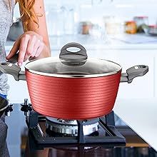 COOL TOUCH HANDLE GRIPS: The pots set features comfortable cool-touch form-fitting handle grips ensuring comfortable & safe cooking, elegant & sleek metallic ridge-line pattern cookware design, stain-resistant, & easy-to-clean dishwasher safe