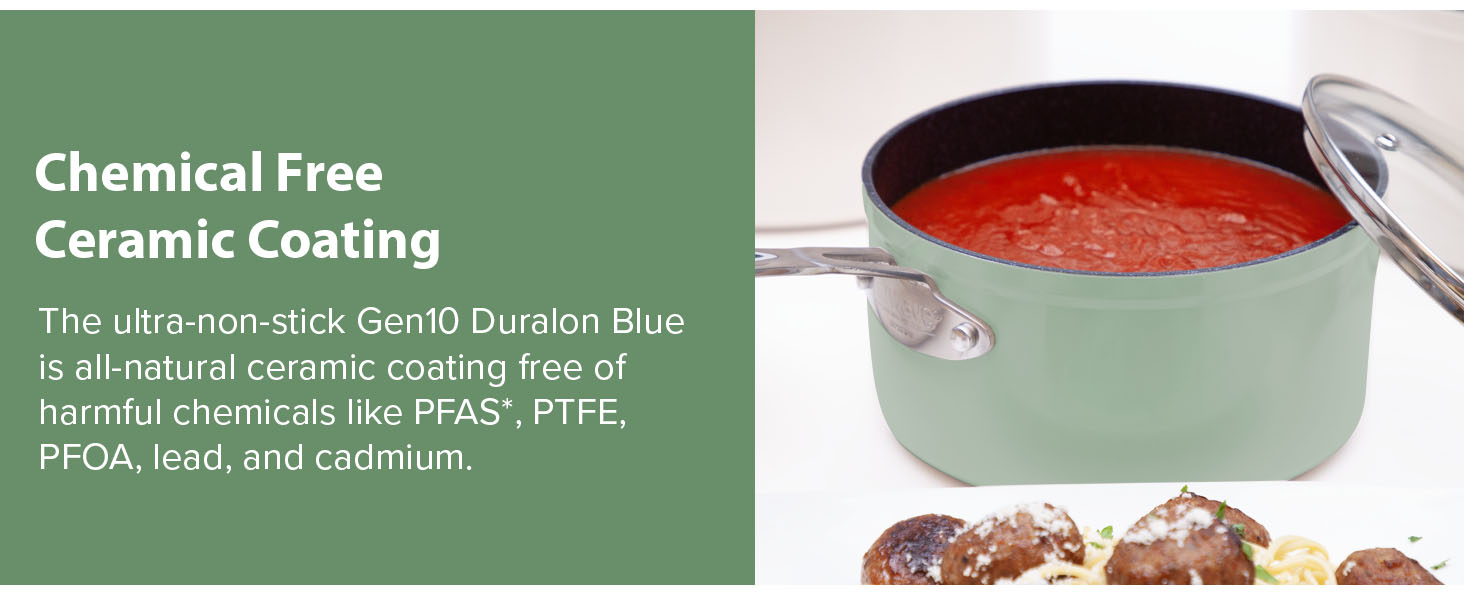 GENERATION 10 (G10) CERAMIC – For more than a decade, we have continuously perfected our Duralon Ceramic Coating. G10 Duralon Blue is exceptional in every category. It heats fast and evenly; releases food effortlessly; and is extraordinarily durable. The ceramic coating is not *chemically* nonstick but gets pretty darn close.