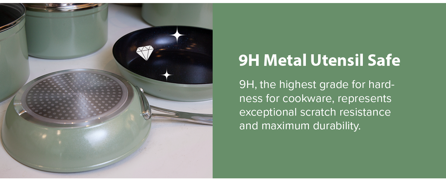 DURALON BLUE HARDNESS – Hardness is rated at 9H. Since diamond is rated at 10H, it is extremely strong. It has HIGH resistances to abrasion, corrosion, and acid meaning. It won’t chip or discolor and will retain its non-stick properties longer.