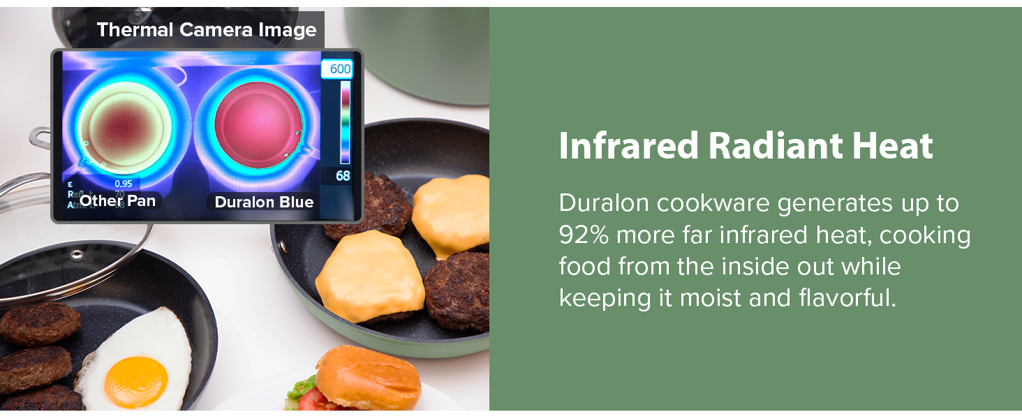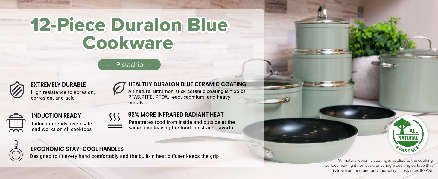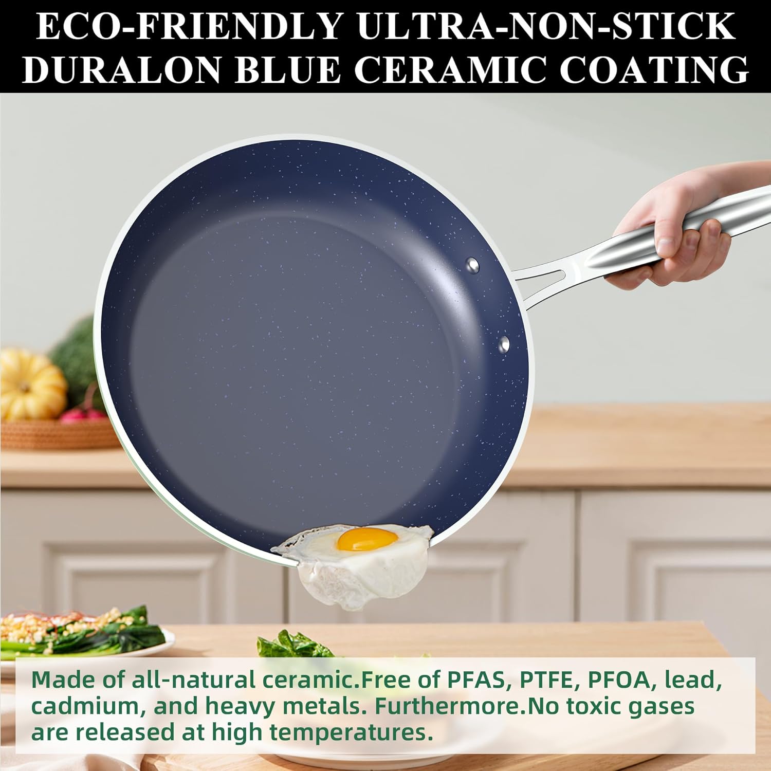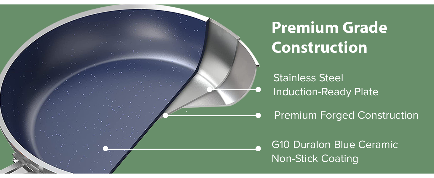 HEALTHY DURALON BLUE COATING – The eco-friendly, ultra-non-stick Gen10 Duralon Blue is all-natural ceramic coating free of harmful chemicals like PFAS*, PTFE, PFOA, lead, and cadmium. It also does not emit toxic gases at higher temperatures. *Tested by TÜV Rheinland for 106 known PFAS elements and none were detected.